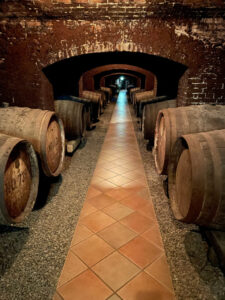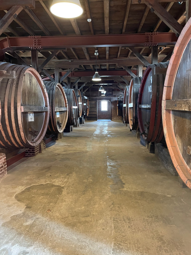 地下はほぼ暗闇に包まれており、写真で見る様な明るさはないのですが、以前使用されていたと思しき巨大なワイン樽が沢山並んでいました。