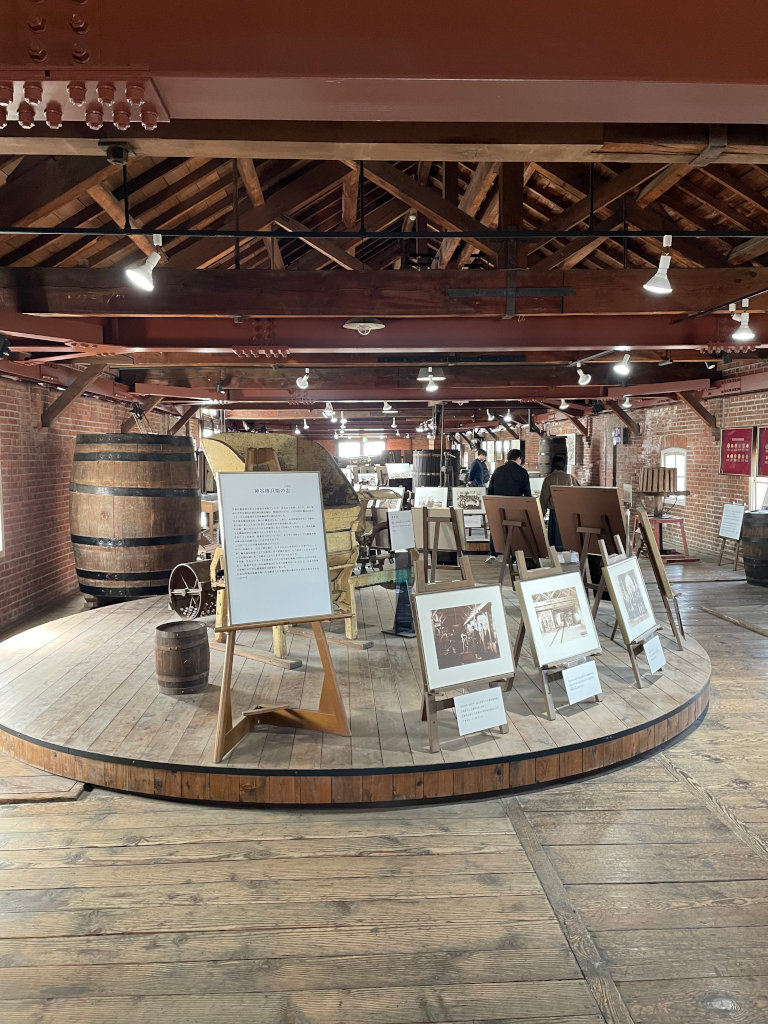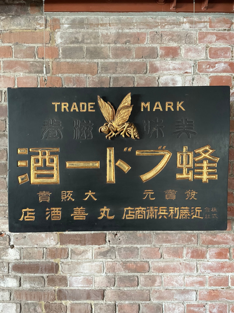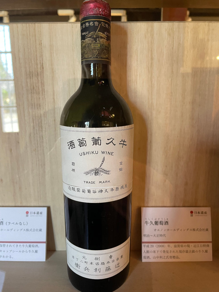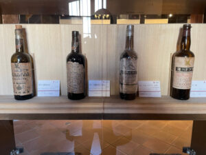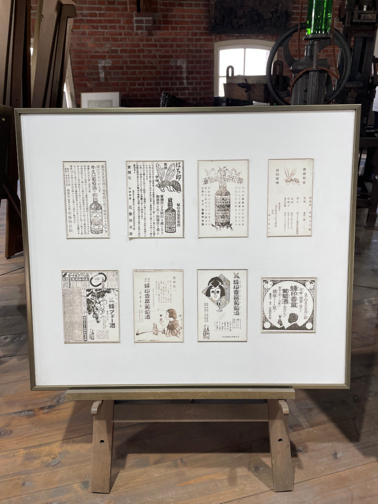 記念館の出口付近には当時のワインボトルが展示されていました。これらは甘味果実酒の方ですね。エチケットにも色々な種類があったようですが、どれもボロボロで長い歴史を感じさせます。余談ですが、今でもポピュラーなサントリーの赤玉スイートワインはこの「蜂印香竄葡萄酒」のヒットに啓発される形で作られた後発商品です。サントリー創業者の鳥井信治郎氏が開発し、当時はかなりライバルを意識していたそうです。