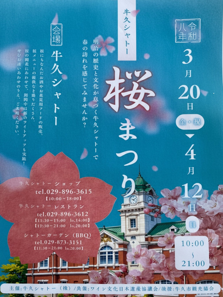 訪問時、ちょうど桜まつりが開催され始めた時期で多くの観光客で賑わっていました。シャトー内には約250本のソメイヨシノがあり、期間中は桜にちなんだお酒やお花見用フードの販売、桜メニューの提供などが行われ、夜には桜のライトアップも実施されるそうです。