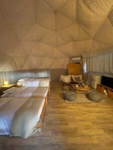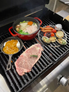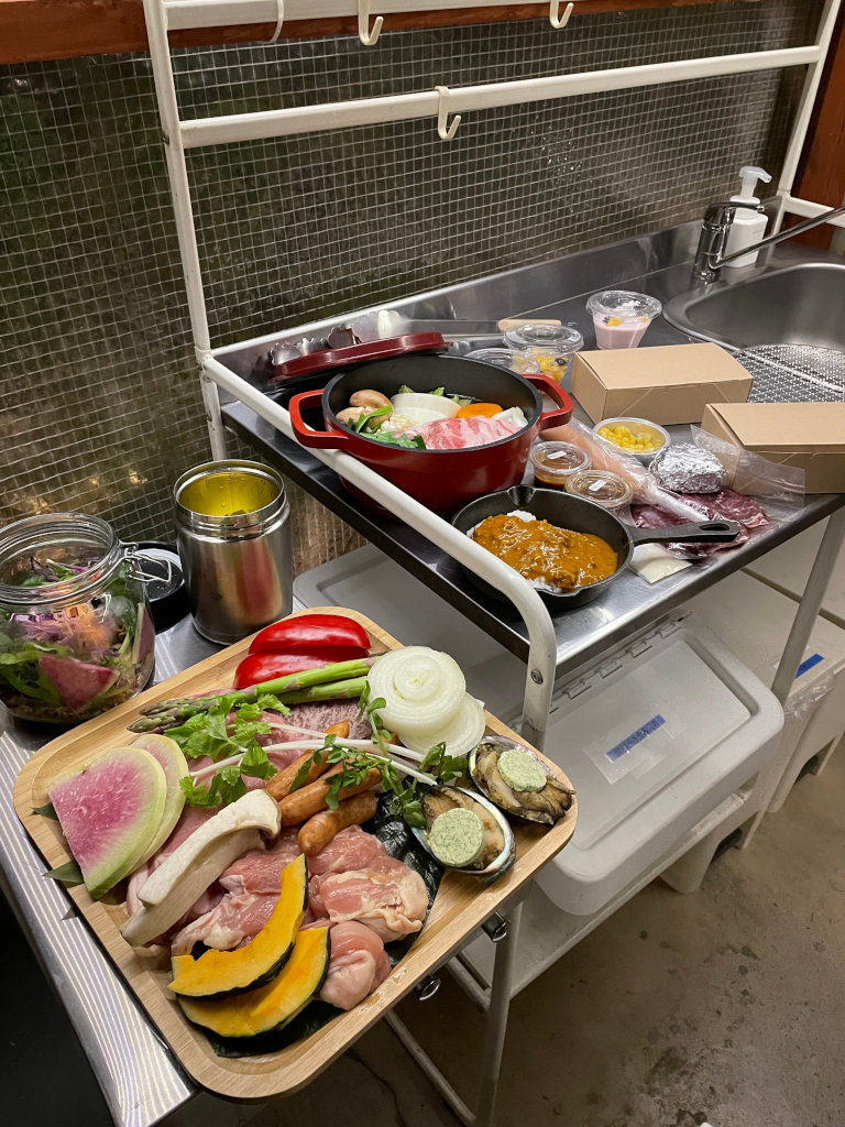 約40平米の室内はこの様な感じで全室シャワー・トイレ・エアコン完備。まるでホテルの様な快適さ。宿泊するドームの横に専用駐車場もあり利便性も抜群。もはやキャンプの要素が無い様な気もしますが、まあ兎に角豪華BBQディナーの始まりです。