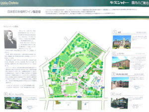 東京ドーム約6個分の広さがあるといわれるヴィンヤードの全体マップです。赤は、メルローやシラー、カベルネ・フラン、白は、シャルドネやソーヴィニヨン・ブランなど約8種類のブドウが垣根方式で栽培されています。