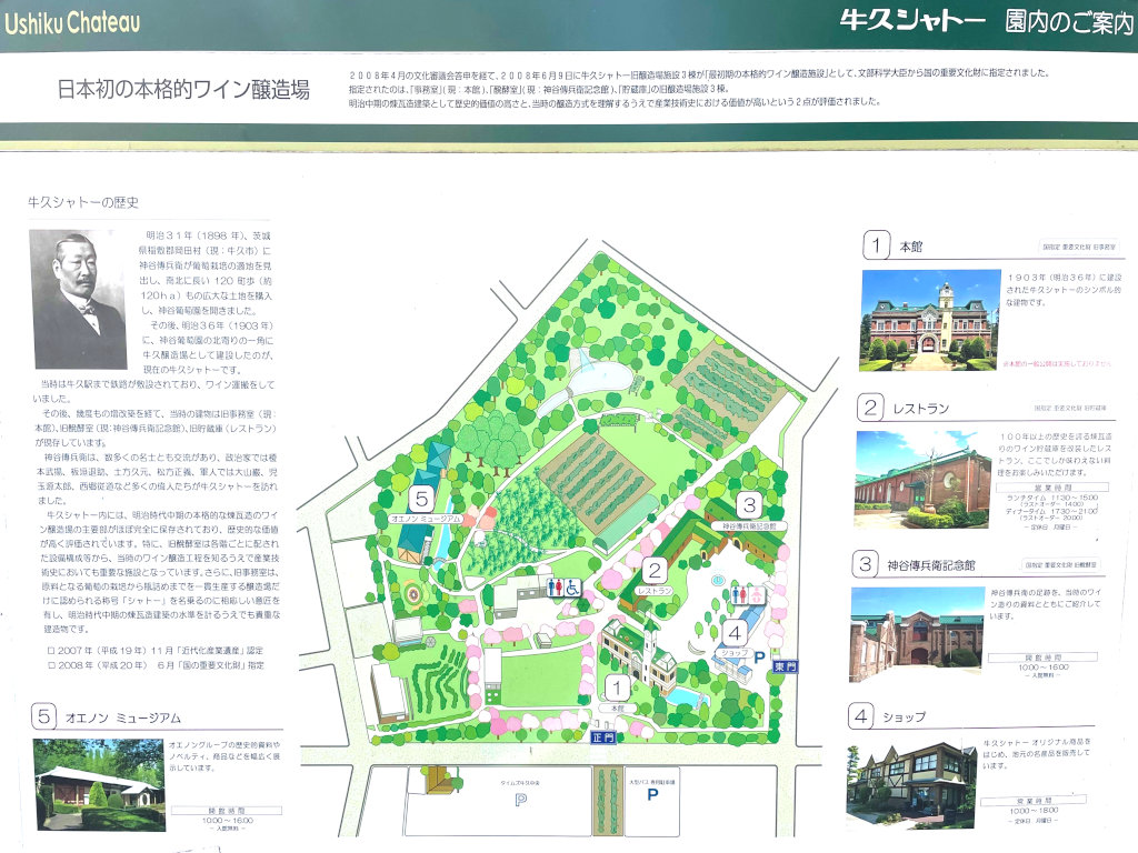 シャトーと名乗るだけあって、施設内には醸造設備やワイン貯蔵庫、葡萄畑もある、1903年に設立された日本初の本格的なワイン醸造場です。当時は牛久駅までワインを運搬する線路が引かれていたとか。現在も当時の建物がいくつも残り、貴重な文化遺産となっています。