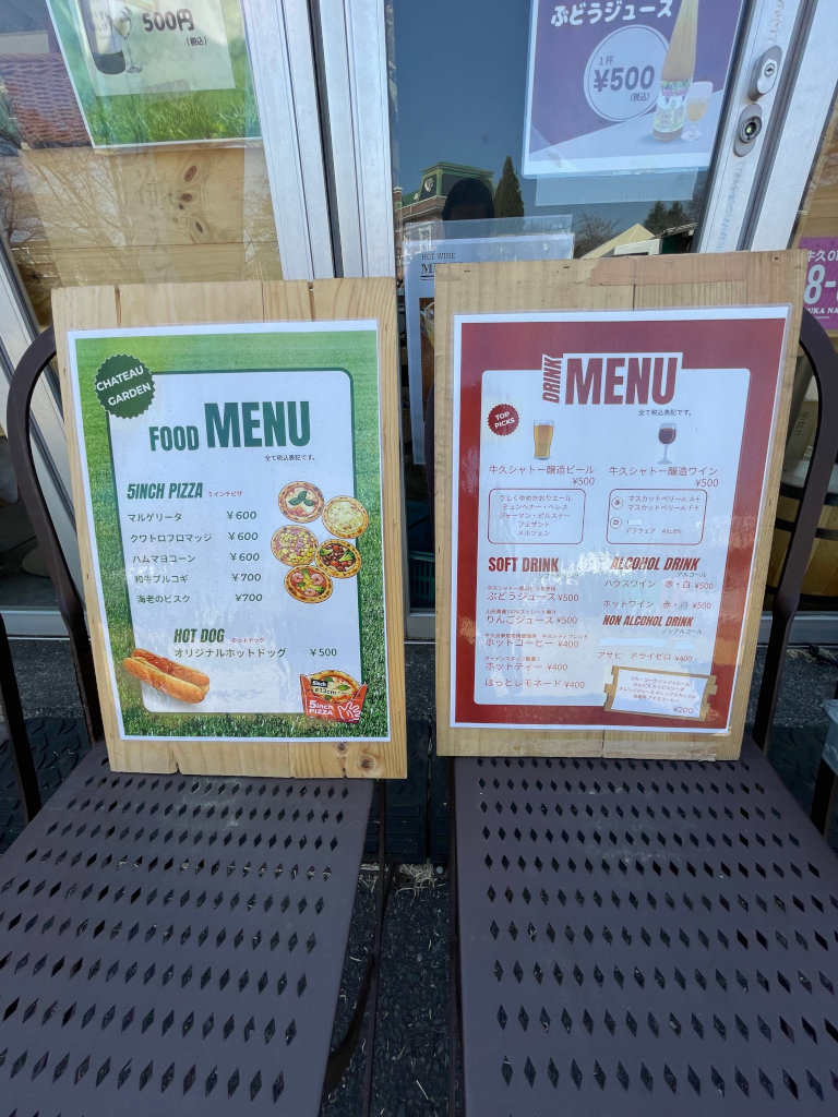 牛久シャトーで造ったワインやビールを片手にピザやホットドッグが楽しめる。うーん、ドライバーで無ければこのポカポカ陽気の昼下がりにぜひぜひ一杯ご馳走になりたかったのですが・・・。