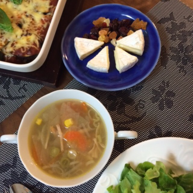 奥、カマンベールチーズとドライフルーツ。手前、野菜スープ。