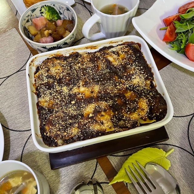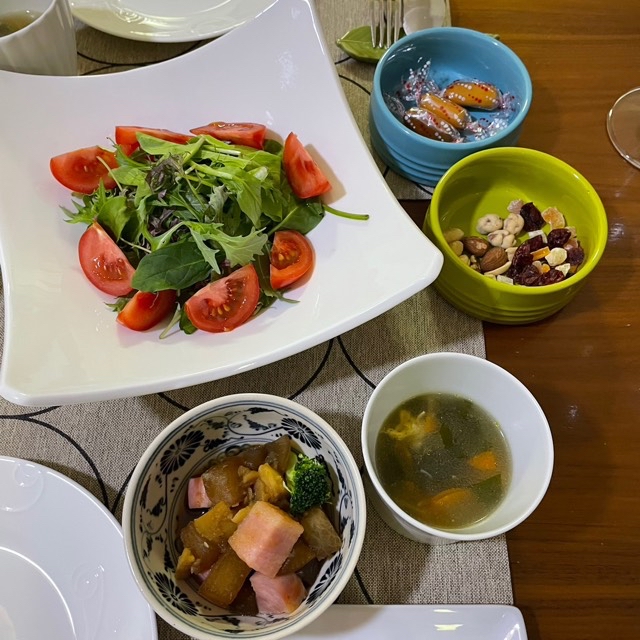 上、トマトグリーンサラダ。左下、大根とさつまいもの煮物。右下、卵野菜スープ。