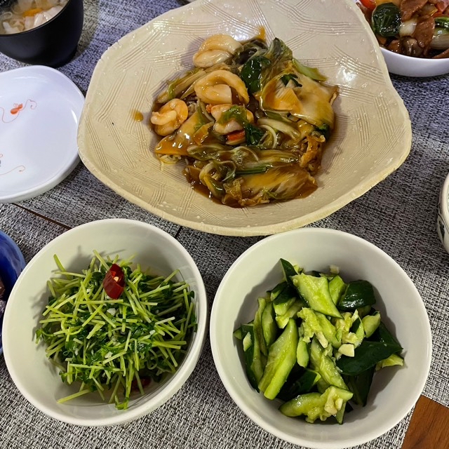 上、五目焼きそば。左下、豆苗炒め。右下、叩ききゅうり。