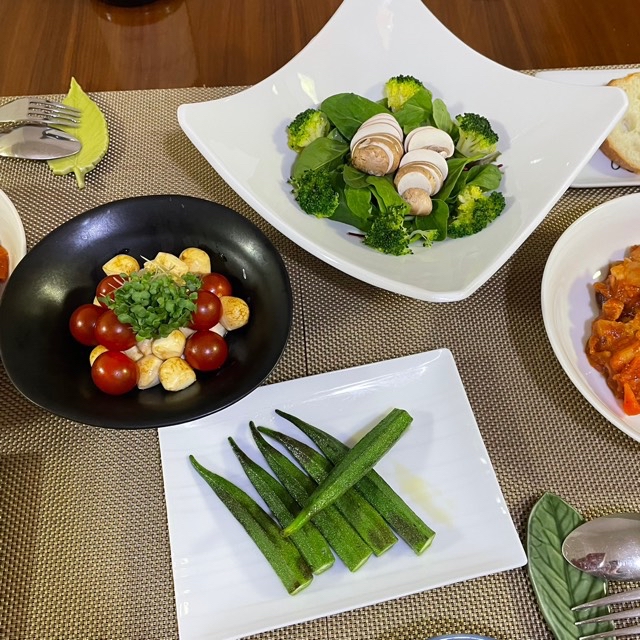 マッシュルームサラダ。ミニトマトのカプレーゼ、最近チーズ嫌いな10歳娘がモッツァレラチーズは食べられると判明。