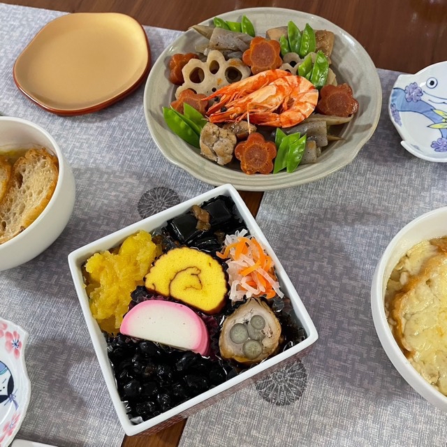 初めて?おにしめと田作りを作りました。おにしめは蓮根をお花型に整えることに苦心。さやえんどうを飾るだけで彩りアップ!めで鯛皿も登場。