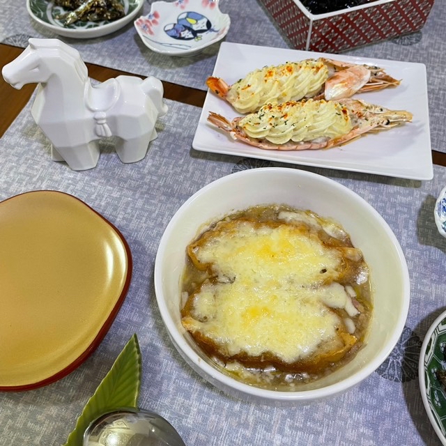 上、赤海老のテルミドール。下、下仁田ネギのグラタンスープ。お伊勢さんの馬の置き物も一緒に!