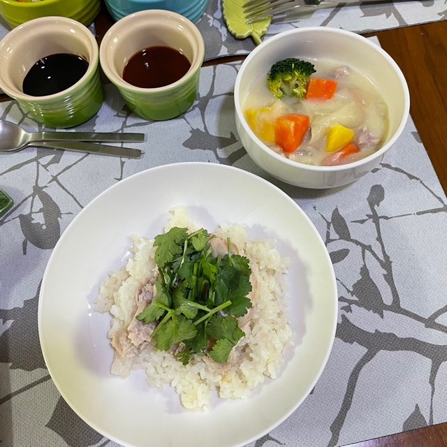 海南鶏飯、シンガポールのチキンライス、カルディで素を購入。パクチーをたっぷり載せて。10歳娘はパクチーパス。甘辛い醤油ベースソースと生姜チリソース付き。