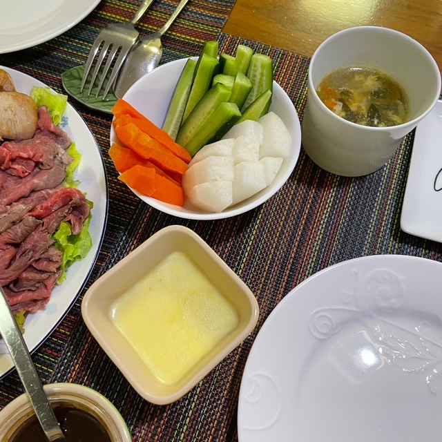 1週間前の残りのラクレットチーズ。右上、野菜卵スープ。