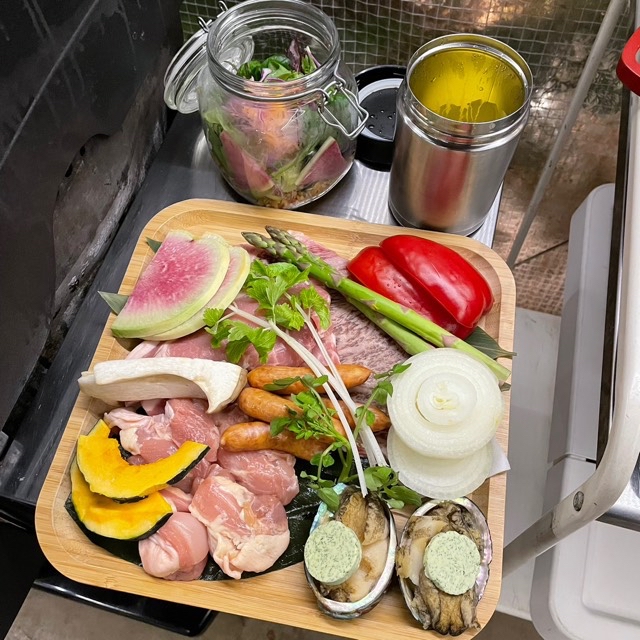 常陸牛サーロイン、国産豚ロース、つくば鶏の塩麹、蝦夷鮑ハーブバター、豚の塩ちゃんこ鍋、キーマカレーライスグラタン、季節の野菜グリル、茨城県産リーフとタブレのジャーサラダ、フルーツマチェドニア、スモア。