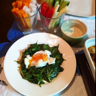 ルッコラの温玉のせ。温玉、いい具合に茹でられた。