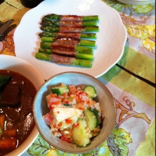手前、サラダライス。カマンベールチーズ、ハム、きゅうりに特製ソース。奥、生ハム巻きアスパラ。
