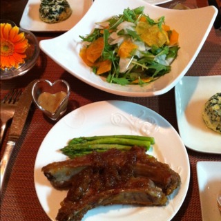柿サラダ。柿、かぶの塩もみ、水菜。ハート型のグラス器はごまドレッシング。