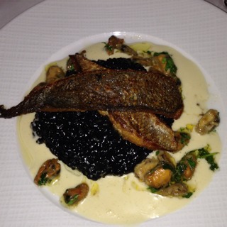 下の黒いのが烏賊墨リゾット、その上にグリル魚、周りのソースにはあさりが散らされている。