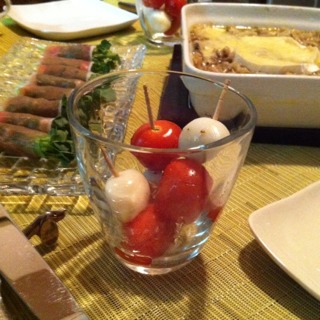 あと一品足したかったので、プチトマトとうずら卵のピンチョス風。つま楊枝で刺して、軽く焼いて塩コショウしただけ。クリスマスにも良いかも!