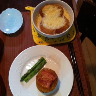 上、オニオングラタンならぬ長ネギグラタンスープ。下、大根ステーキ。ベーコンと大根を交互に3段重ね、美味。長ネギも大根も冷蔵庫にあったもの…