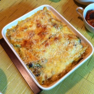 マカロニグラタン。隠れて見えないけど、にんじん、玉ねぎ、しめじ、ブロッコリーと野菜がたくさん入っている。肉系はベーコン少量のみ。