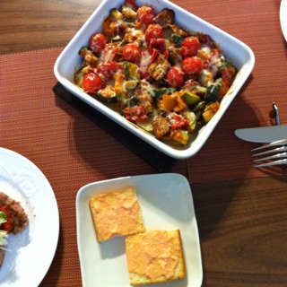 奥、彩り野菜とじゃがいものオーブン焼き。手前、たらこトースト。
