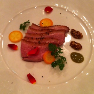 前菜2、鴨のロースト、オレンジのはきんかんスライス。
