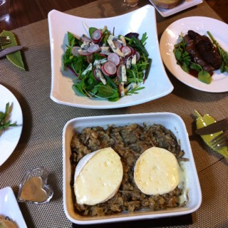 上、ゴルゴンゾーラチーズサラダ。下、きのこリゾット、最後にカマンベールチーズまるごとを割ってチン。