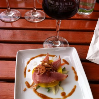 蟹身とりんごのムース、白ワインと。タイのワイナリーにて、3種のワインテイスティングにそれぞれ小料理がついてきたが、美味しいのが一つもなかった。。。