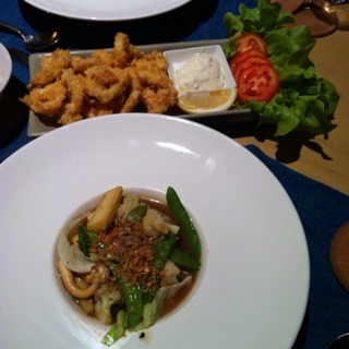 上、カラマリ。下、野菜のオイスター炒め。ランチもしっかり食べてたので、このくらいの量で充分だった。