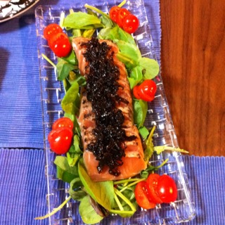 炙りサーモン玉ねぎバルサミコソテー。しっかり味の玉ねぎバルサミコソテーがあるので、サーモンでも赤ワインに合う。