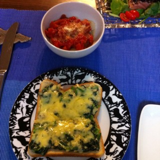 上、ニョッキトマトソース。下、ほうれん草のグラタントースト。