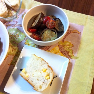 上、なすとプチトマトのナムル風。下、チーズパン。