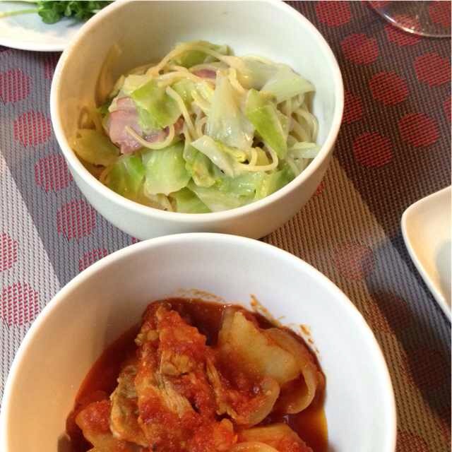 奥、キャベツとベーコンのアンチョビパスタ。アンチョビ味が美味。