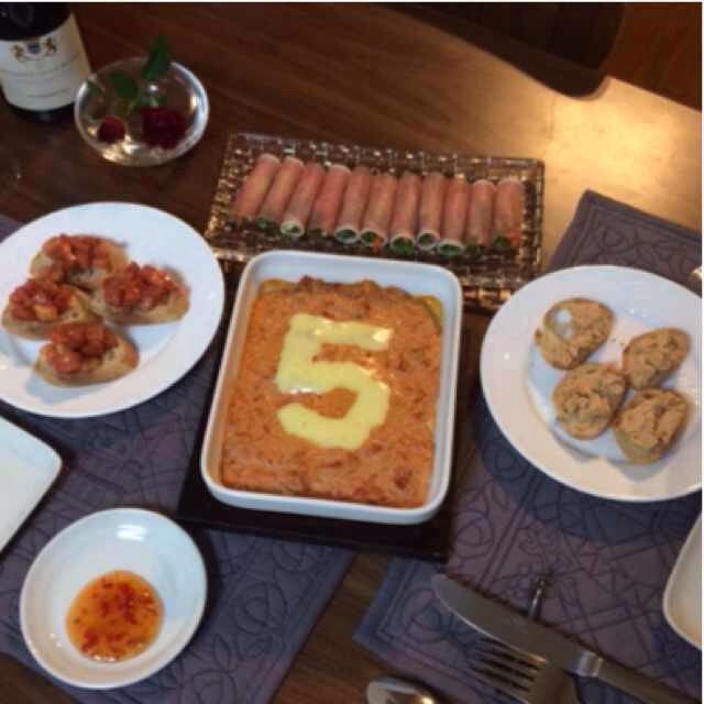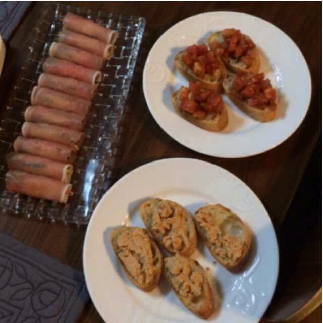 左、生ハム野菜巻き。右上、トマトブリュスケッタ。右下、鮭パテのブリュスケッタ。