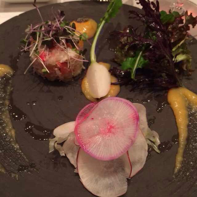 前菜1。カニと蕪、柿のタルタル仕立て。前菜+メイン+デザートで一人¥4950のコースを二人でいただいた。