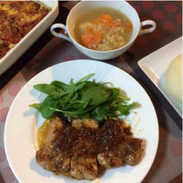 豚肉のステーキねぎソース。長ねぎみじん切りとしょうがみじん切り、バターと醤油で味付け。ワインにも合いました。