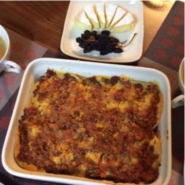 手前、ぎょうざの皮のなすのラザニア。奥、チーズとぶどう。