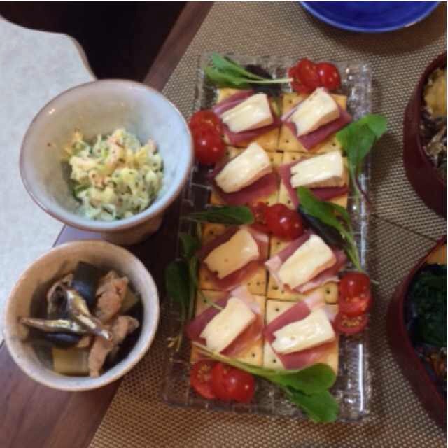 左、オードブル。クラッカーに生ハムとカマンベールチーズ。