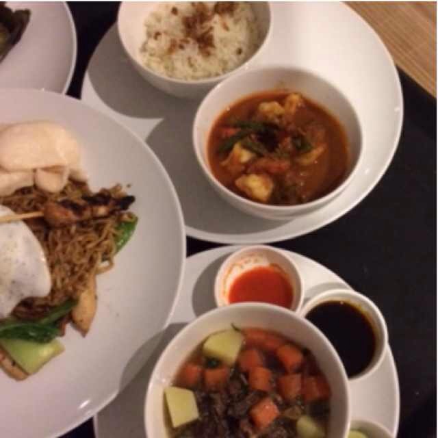 すべてインドネシア料理。上Sate campurチキン、ポークの串焼き、Sticky Rice、野菜炒めなどの前菜。下Mie Goreng。