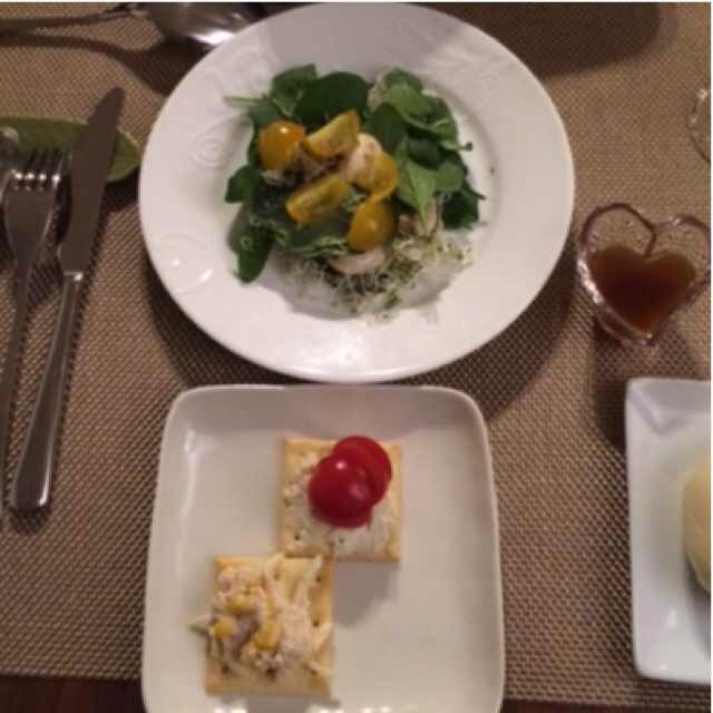 上、ほうれん草サラダ。下、カナッペ。ブルサンチーズ+ミニトマト。ツナマヨ。