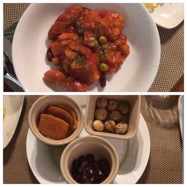 上、メインのカスレ。下、お土産のドライマンゴー、干しブドウ、ドライいちじく。