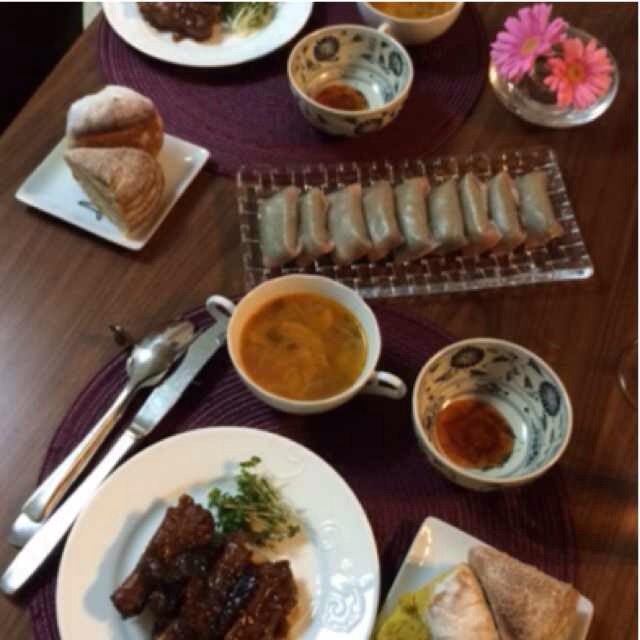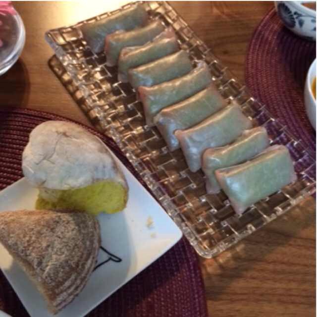 右、生春巻き。大葉、生ハム、きゅうり、スプラウト、チームを巻いている。左、友人の手づくり、かぼちゃパンと全粒粉パン。