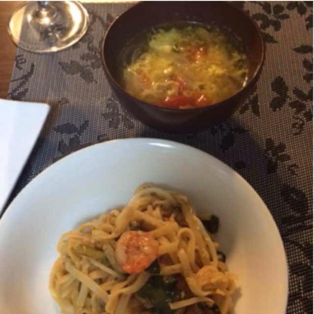 奥、中華スープ。トムヤムクンは辛いもの控えてるし、カーカイもココナッツがお腹ゆるくなるので、中華スープに^^;