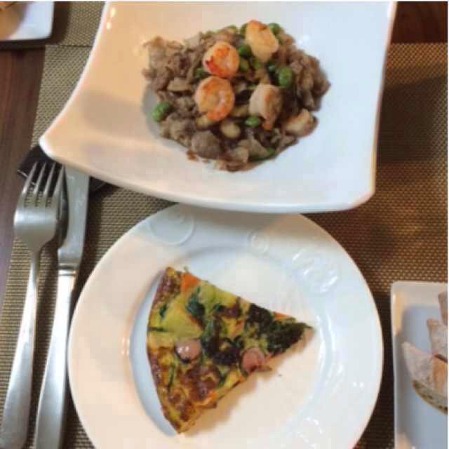 上、豚肉スペイン風。下、スペイン風オムレツ。