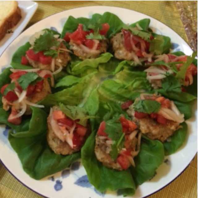 豚肉のアジアンつくね。つくねにパクチーを練り込んで、ソースにニョクマムとレモン(ライム)を使ってるので、タイ風。