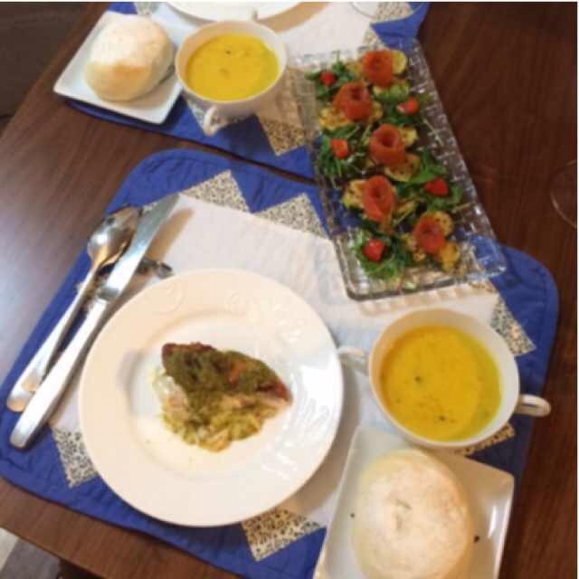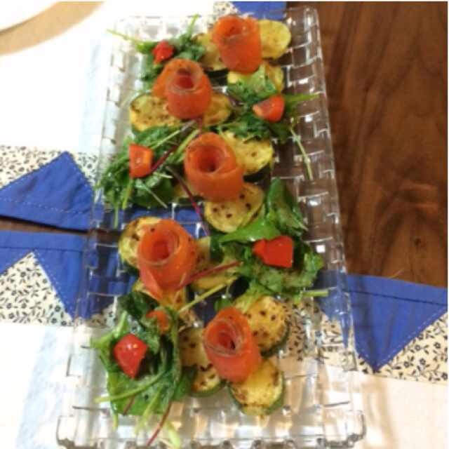 サーモンマリネ薔薇仕立てサラダ。サーモンが小ぶりだったせいか、キレイに薔薇にならなかった…