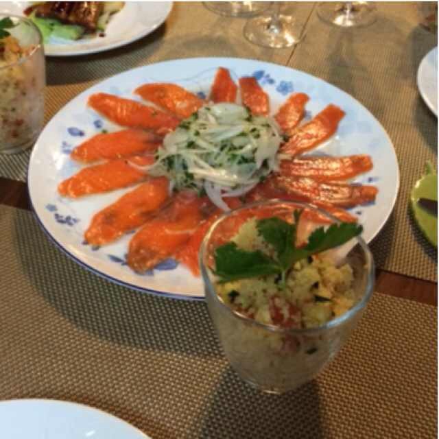 サーモンのカルパッチョ。オリーブオイルとレモンと塩コショウで、さっぱりと。