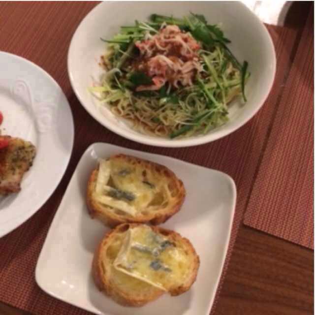 右上、サラダ冷やし中華。サラダはきゅうり、スプラウト、三つ葉。冷やし中華のスープを減らして和風ドレッシングも加えた。麺は半人前ずつ。トッピングにカニカマ。