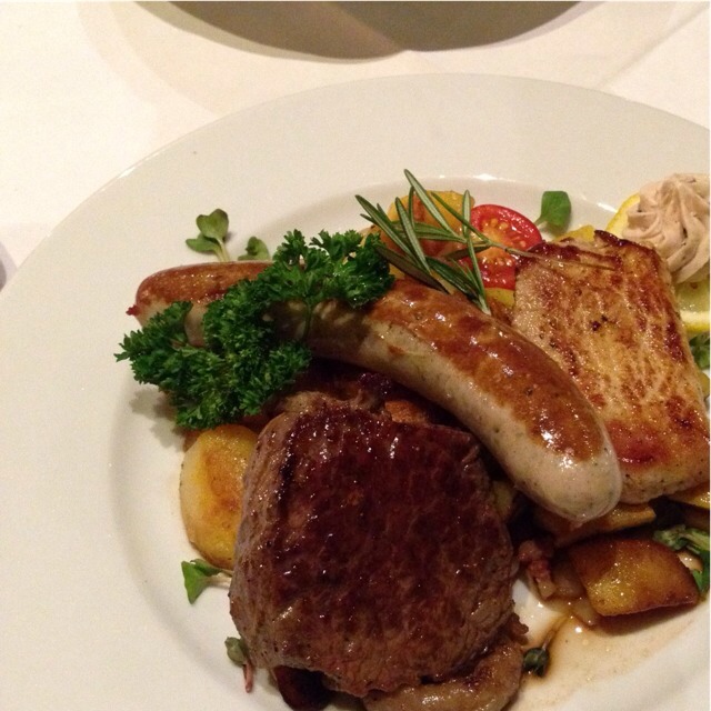 ソーセージ、チキン、牛肉の盛り合わせ。下にはベイクドポテト。やっぱりソーセージが美味しい。