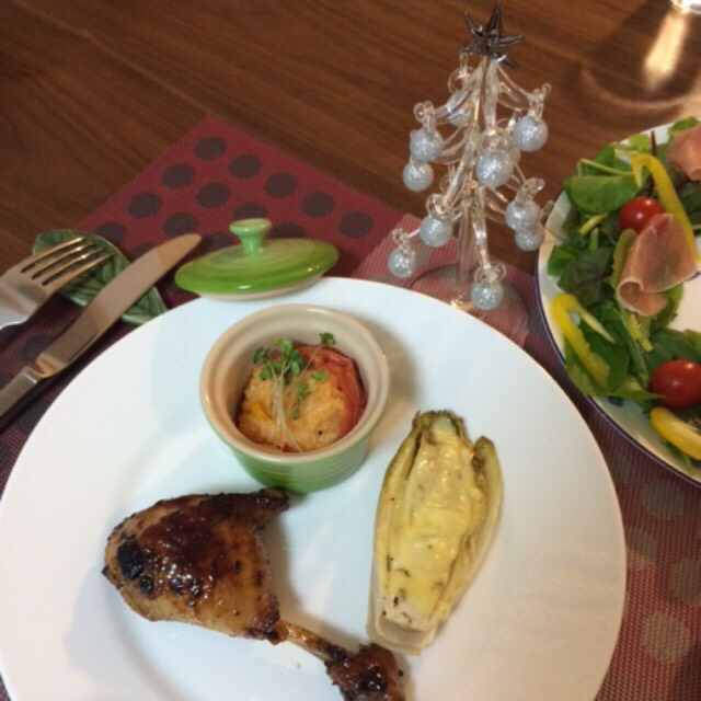 奥、トマトリゾット焼き。右、チコリチーズ焼き。左、チキン。