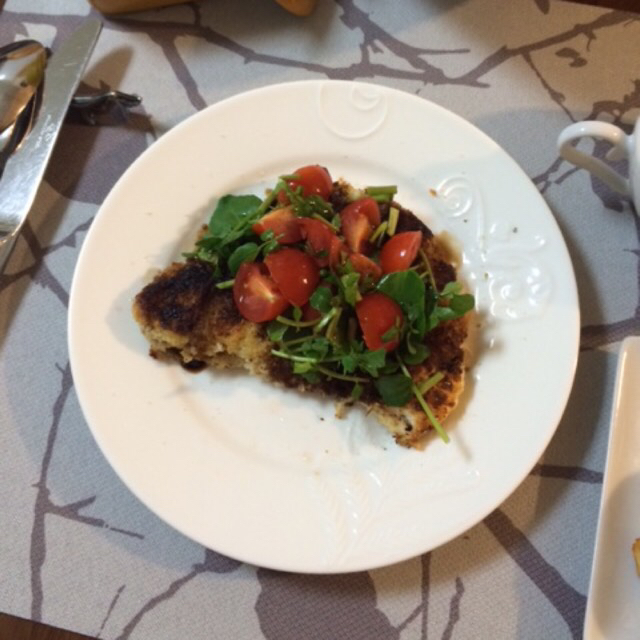 ミラノ風カツレツ。バルサミコソースとレモンにトマトとルッコラで飾り。定番の美味しさ。